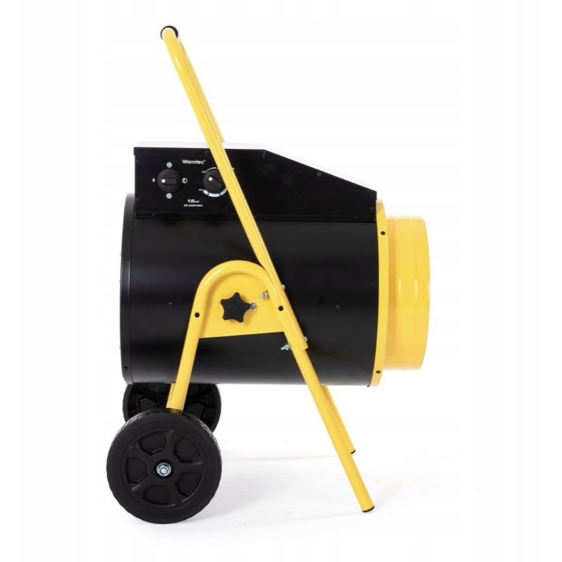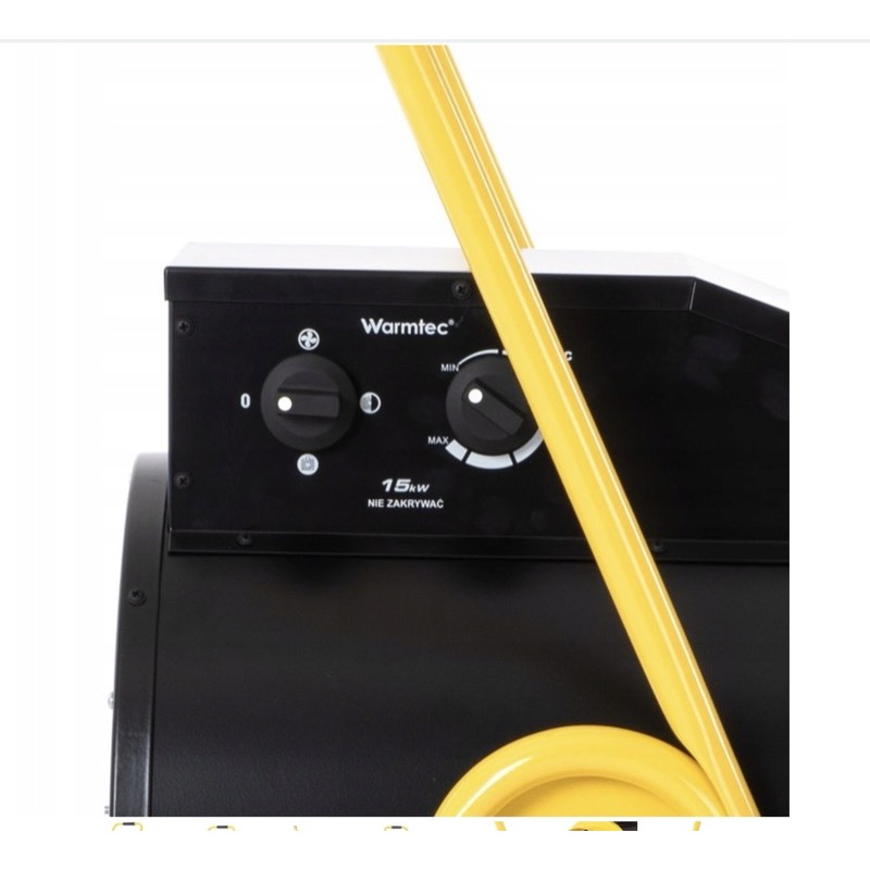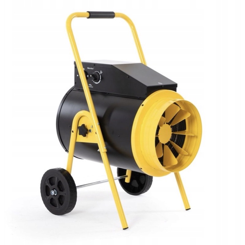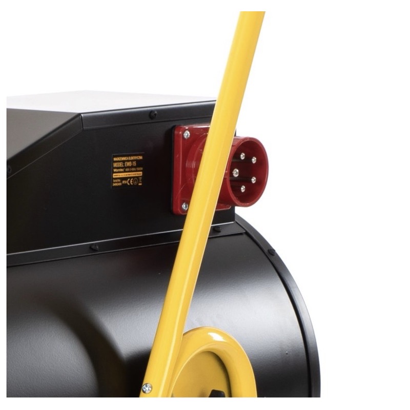 Przemysłowa nagrzewnica elektryczna 15 kW z nawiewem. Zasilanie 400V (trójfazowe). Regulacja mocy w 4 stopniach, wbudowany termostat. Bez spalin, zapachu i wilgoci. Do hal, magazynów, warsztatów i pomieszczeń w trakcie prac remontowych. Przepływ powietrza 1100 m³/h. Waga 22 kg.